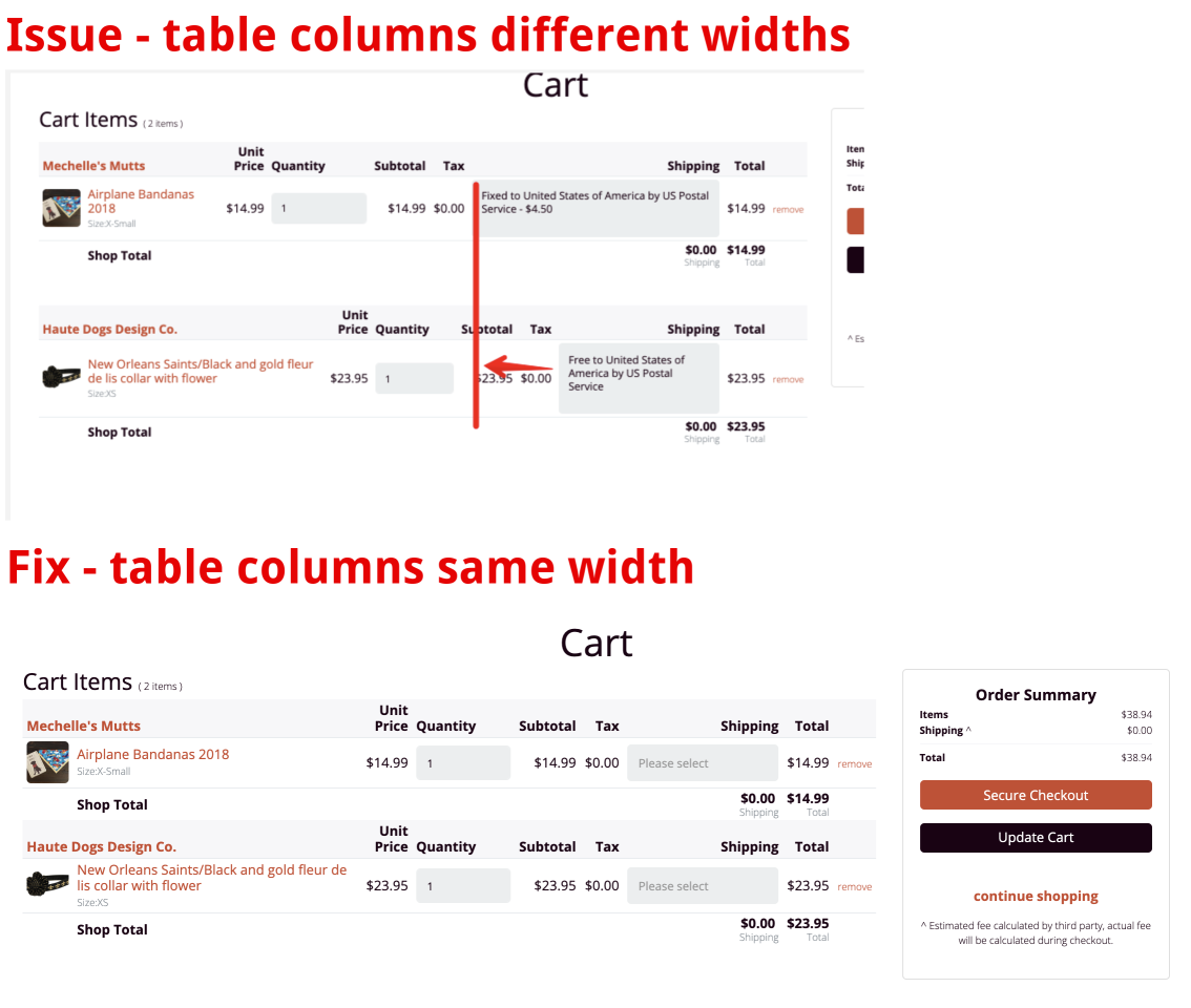 Ecommerce - Adjust cart table so all columns are same width for all shops